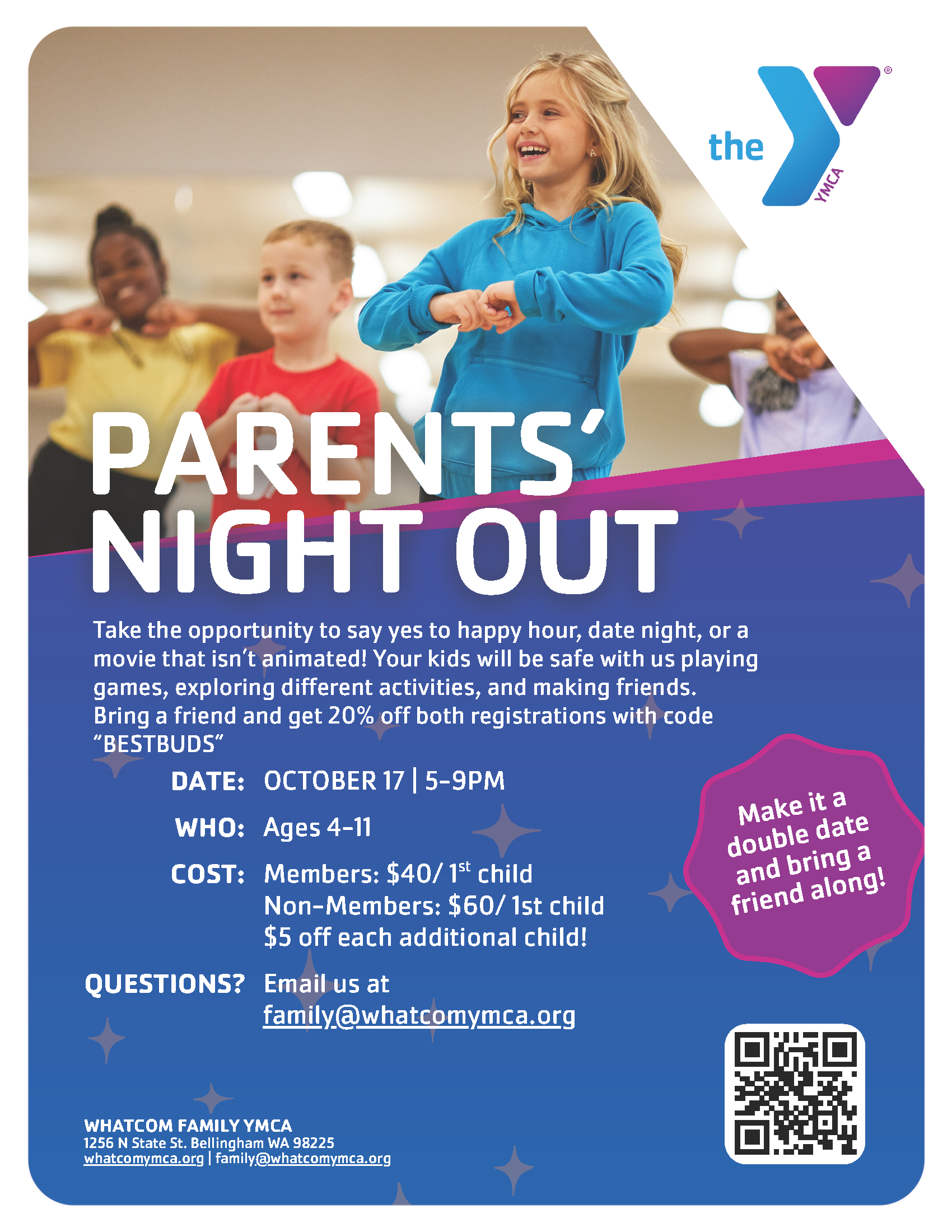 Join us for Parents’ Night Out at the Whatcom Family YMCA. Drop off your kids for a safe and fun evening filled with games, friends, and adventures while you enjoy a well-deserved break.